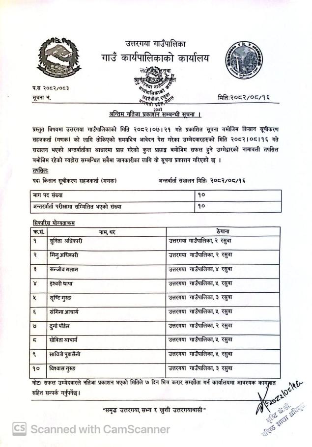 जनस्वास्थ्य अधिकृत, मनोसामाजिक परामर्शकर्ता तथा रिटर्नी स्वयंसेवकको अन्तिम नतिजा प्रकाशन सम्बन्धी सूचना ।