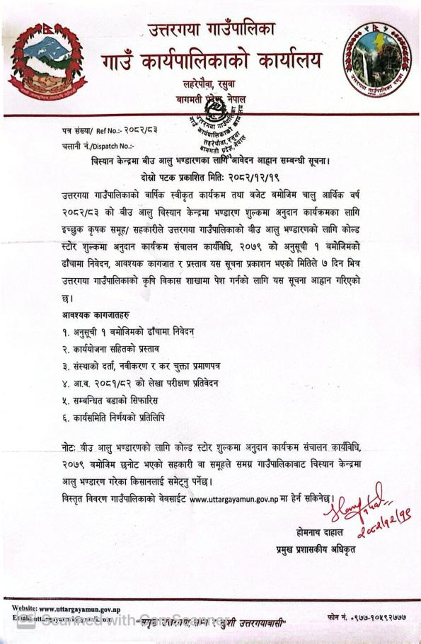 चिस्यान केन्द्रमा बीउ आलु भण्डारणका लागि आवेदन आह्वान सम्बन्धी सूचना । दोस्रो पटक प्रकाशित मितिः २०८२/१२/१९