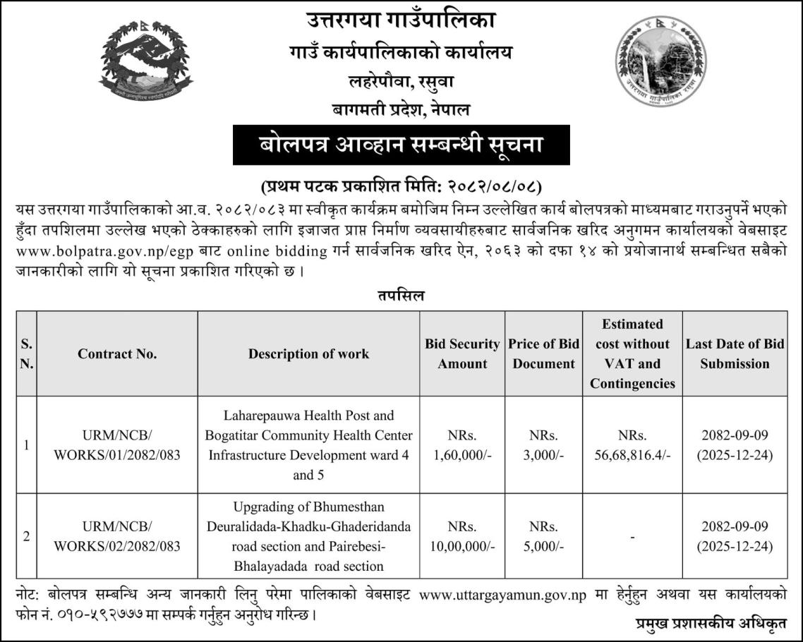 बोलपत्र आह्वान सम्बन्धी सूचना ।(Laharepauwa Health Post and Bogatitar Community Health Center Infrastructure Development ward 4 and 5 and Upgrading of Bhumesthan-Deuralidada-Khadku-Ghaderidanda road section and Pairebesi-Bhalayadada road section )