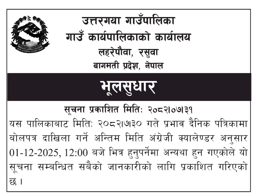 मिति २०८२/०७/३० गते प्रकाशित सूचनामा भुलसुधार गरिएको सम्बन्धमा ।