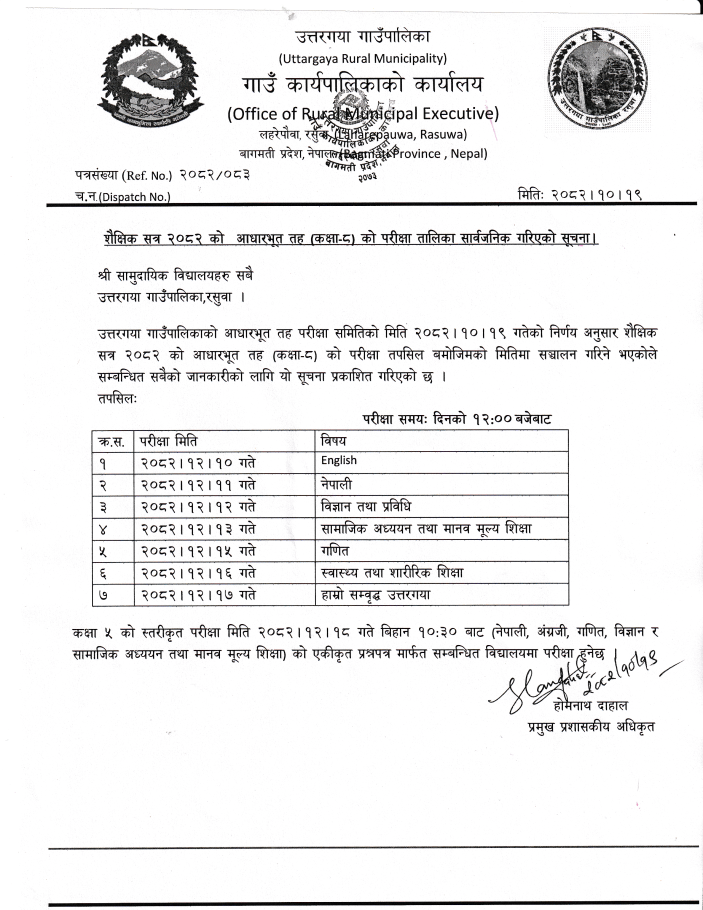 शैक्षिक सत्र २०८२ को आधारभूत तह (कक्षा ८) को परीक्षा तालिका सार्वजनिक गरिएको सूचना ।