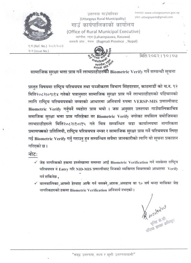सामाजिक सुरक्षा भत्ता प्राप्त गर्ने लाभग्राहीहरुको Biometric Verify गर्ने सम्बन्धी सूचना ।